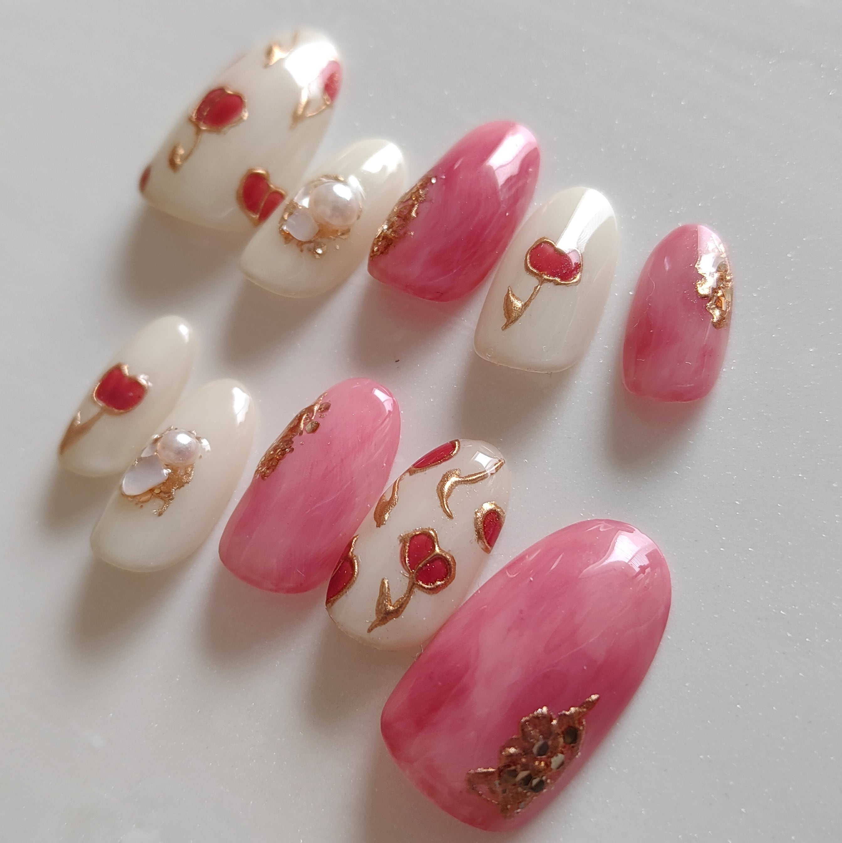 ✻*·. 花咲くロココ .·*✻ 和装にも洋装にも合わせやすい まるで絵画のような芸術的な美しさ 柔らかなピンクとオフホワイトを基調 可愛らしくも大人っぽい洗練されたデザイン ❥おすすめの使用シーン ブライダルや特別なイベントなどお祝い事での使用がオススメ◎ 可愛らしさもあるデザインなのでデートや特別な日のオシャレ、指先を華やかに彩りたい方にもオススメです。 ❥デザインのおすすめポイント 透明感のあるピンクがマーブル模様になり奥行き感をプラス 立体的な装飾がアクセントとなり上品な輝きを演出 春の訪れを感じさせるような軽やかさもありつつ、ゴールドの流れるようなラインがエレガントな印象も与えてくれます ✻----- お届け内容 -----✻ ネイルチップ ▷ 両手10本分 ネイルチップ取扱い説明書 消毒用アルコールシート × 1 ミニやすり × 1 ミニスポンジ × 1 ウッドスティック × 1 ネイルチップ粘着両面テープ × 1回分 →オプションにて追加購入可能 ✻----- Option -----✻ ◇計測用チップ 2種類までは追加料金なしでお届けいたします。 3種類~は追加料金が発生いたします。 すでに計測用チップをお持ちの方は【 持ってるよ 】をお選びください。カートに入れた後、ご希望のチップ名称を備考欄にご記入ください。 ◇親指ストレート加工 親指の根元をストレート加工に仕上げます。 詳細は9枚目の写真をご確認ください。 【 1デザインに対して +300円 】 商品をカートに入れる際、一緒にお選びください。 後からストレート加工を希望された場合は、専用ページにてご案内いたします。 ◇粘着テープ 1回分は付属品としてついてきます。 追加したい場合はオプションから追加購入が可能です。 ◇ケース 通常、専用の台紙でお届けいたします。 持ち運び用の専用ケースやギフト用の専用BOXもオプションにてお選びいただけます。 ✻----- 注意事項 -----✻ 1.ネイルチップはすべてご注文を受けてから1点1点手作業にてお作りしております。 細心の注意を払い作成しておりますが、稀に多少の色ムラや気泡が入る場合もございます。 2.ニュアンスアート部分は色の重なり具合や滲み方、広がり方など、筆のタッチによって絶妙な個体差が生まれます。 サンプル写真を再現するよう最大限務めておりますが、ニュアンスアート独自の性質なので、世界に一つのデザインとしてお楽しみください。 3.使用しているシェルパーツは天然のものなので、大きさや形に個体差があります。 4.計測用チップを使用せず、ご自身での自己計測の場合、計測ミスによる返品・交換はお受けできかねます。 5.ご入金確認後のキャンセルやイメージと違ったなどの理由によるキャンセルはお受けできかねます。 ご質問等ございましたらお気軽にお問合せください。