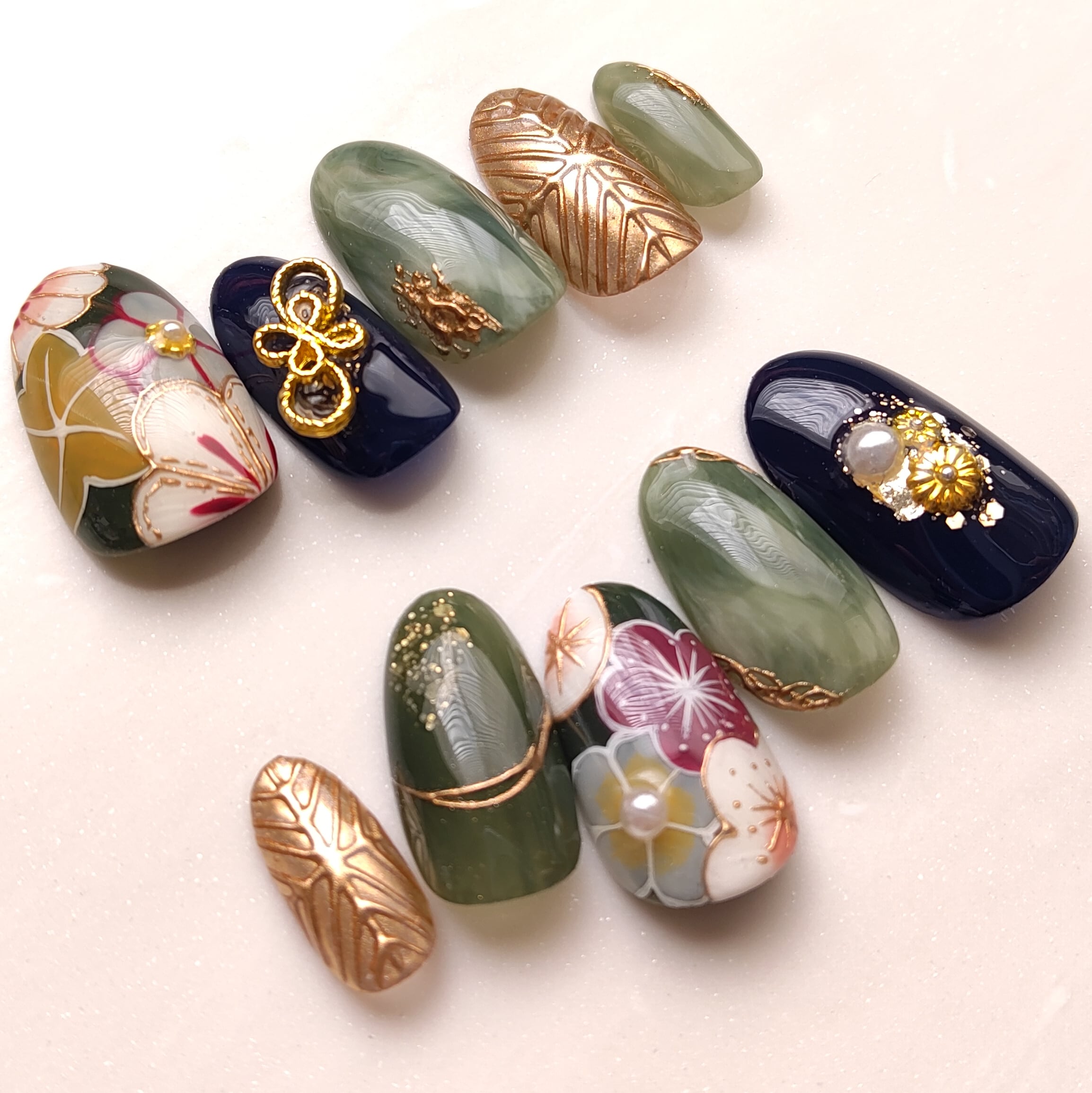 ✻*·. 指先の万華鏡 .·*✻ 和風の要素と現代的な洗練さが融合 まるで万華鏡のような変化が楽しめます 華やかな装飾がアクセントになり宝石のような輝き 伝統的な和柄の要素に現代的なアートワークの組み合わせ 遊び心と統一感が両立した上品で個性的なデザイン ❥おすすめの使用シーン 成人式や着物に合わせるのはもちろん、お祭りや特別なイベント時にもオススメ◎ 普段使いとして使用すればゴージャスで存在感がでます ❥デザインのおすすめポイント 和柄部分には金色の縁取りや小さなスタッズが華やかさを添えています 深いネイビーブルーの装飾は宝石のような輝きで目を引くアクセントに 左右で主要なモチーフの色味を反転させたり共通のデザインをおくことで、モダンな印象にも仕上がりました ✻----- お届け内容 -----✻ ネイルチップ ▷ 両手10本分 ネイルチップ取扱い説明書 消毒用アルコールシート × 1 ミニやすり × 1 ミニスポンジ × 1 ウッドスティック × 1 ネイルチップ粘着両面テープ × 1回分 →オプションにて追加購入可能 ✻----- Option -----✻ ◇計測用チップ 2種類までは追加料金なしでお届けいたします。 3種類~は追加料金が発生いたします。 すでに計測用チップをお持ちの方は【 持ってるよ 】をお選びください。カートに入れた後、ご希望のチップ名称を備考欄にご記入ください。 ◇親指ストレート加工 親指の根元をストレート加工に仕上げます。 詳細は9枚目の写真をご確認ください。 【 1デザインに対して +300円 】 商品をカートに入れる際、一緒にお選びください。 後からストレート加工を希望された場合は、専用ページにてご案内いたします。 ◇粘着テープ 1回分は付属品としてついてきます。 追加したい場合はオプションから追加購入が可能です。 ◇ケース 通常、専用の台紙でお届けいたします。 持ち運び用の専用ケースやギフト用の専用BOXもオプションにてお選びいただけます。 ✻----- 注意事項 -----✻ 1.ネイルチップはすべてご注文を受けてから1点1点手作業にてお作りしております。 細心の注意を払い作成しておりますが、稀に多少の色ムラや気泡が入る場合もございます。 2.ニュアンスアート部分は色の重なり具合や滲み方、広がり方など、筆のタッチによって絶妙な個体差が生まれます。 サンプル写真を再現するよう最大限務めておりますが、ニュアンスアート独自の性質なので、世界に一つのデザインとしてお楽しみください。 3.計測用チップを使用せず、ご自身での自己計測の場合、計測ミスによる返品・交換はお受けできかねます。 4.ご入金確認後のキャンセルやイメージと違ったなどの理由によるキャンセルはお受けできかねます。 5.深みのあるグリーンを写真で再現するため1枚目の写真は暗めとなっております。 ご質問等ございましたらお気軽にお問合せください。