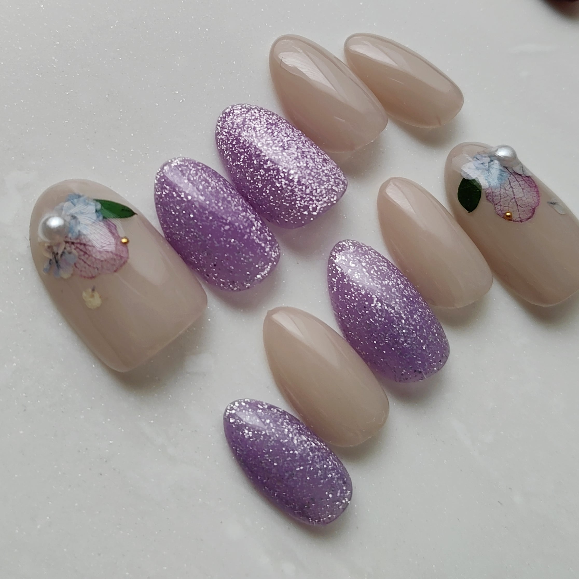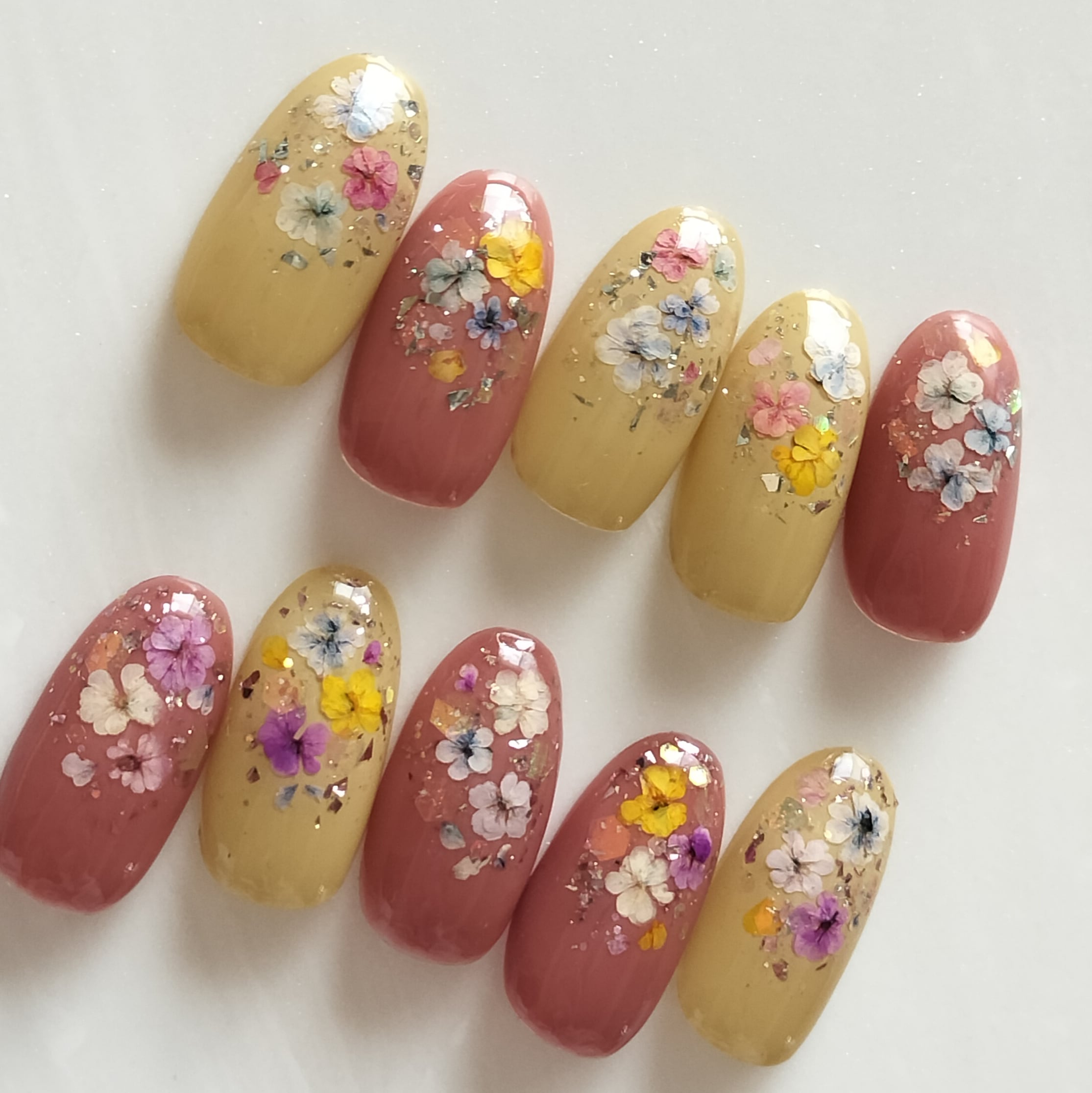 ✻*·. りんご姫に憧れて .·*✻ 押し花の繊細さとラメの輝きが指先を美しく彩る 魔法の国のりんご姫に憧れたカラー使い 春らしいイエローとピンクが基調となった 春の装いにぴったりなフェミニンで優しい印象 ❥おすすめの使用シーン 入学式や卒業式、結婚式など特別な日の装いにもオススメなデザインです。 普段使いにも取り入れやすい上品さも兼ねています。 ❥デザインのおすすめポイント 様々な色の押し花が繊細に配置され、まるで小さな花束みたい 左右でベースカラーと押し花の色味を少しずつ変えることで、統一感がありつつも個性も際立つデザインに仕上がりました ✻----- お届け内容 -----✻ ネイルチップ ▷ 両手10本分 ネイルチップ取扱い説明書 消毒用アルコールシート × 1 ミニやすり × 1 ミニスポンジ × 1 ウッドスティック × 1 ネイルチップ粘着両面テープ × 1回分 →オプションにて追加購入可能 ✻----- Option -----✻ ◇計測用チップ 2種類までは追加料金なしでお届けいたします。 3種類~は追加料金が発生いたします。 すでに計測用チップをお持ちの方は【 持ってるよ 】をお選びください。カートに入れた後、ご希望のチップ名称を備考欄にご記入ください。 ◇親指ストレート加工 親指の根元をストレート加工に仕上げます。 詳細は10枚目の写真をご確認ください。 【 1デザインに対して +300円 】 商品をカートに入れる際、一緒にお選びください。 後からストレート加工を希望された場合は、専用ページにてご案内いたします。 ◇粘着テープ 1回分は付属品としてついてきます。 数種類の厚みを取り扱っているため厚みを指定していただくことも可能です。 各テープの詳細は11枚目の写真をご確認ください。 追加したい場合はオプションから追加購入が可能です。 ◇ケース 通常、専用の台紙でお届けいたします。 持ち運び用の専用ケースやギフト用の専用BOXもオプションにてお選びいただけます。 ✻----- 注意事項 -----✻ 1.ネイルチップはすべてご注文を受けてから1点1点手作業にてお作りしております。 細心の注意を払い作成しておりますが、稀に多少の色ムラや気泡が入る場合もございます。 2.当ショップで取り扱っている押し花はすべて本物の生花から一枚一枚作られたものです。 サンプル写真と同じ色味の花でも大小の個体差があります。同じ色味の花がなくなった場合は似た色味のお花で作成いたしますので、生花から作られた押し花だからこその、世界に一つのデザインとしてお楽しみください。 3.計測用チップを使用せず、ご自身での自己計測の場合、計測ミスによる返品・交換はお受けできかねます。 4.ご入金確認後のキャンセルやイメージと違ったなどの理由によるキャンセルはお受けできかねます。 ご質問等ございましたらお気軽にお問合せください。